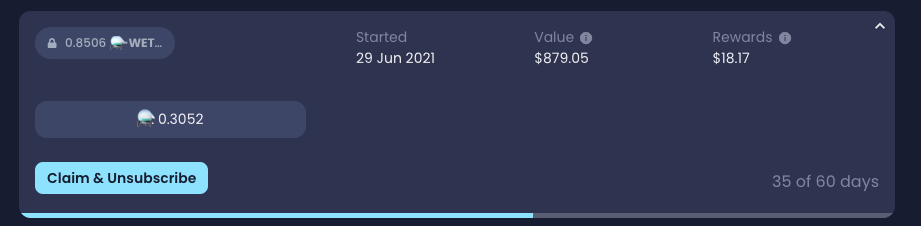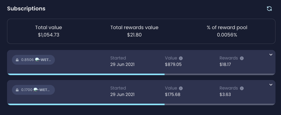 You can now see your individual subscriptions at an overview, and see how they are performing in terms of rewards, the cyan bar at the bottom of your subscription represents your multiplier growth against the scaling period.<br>